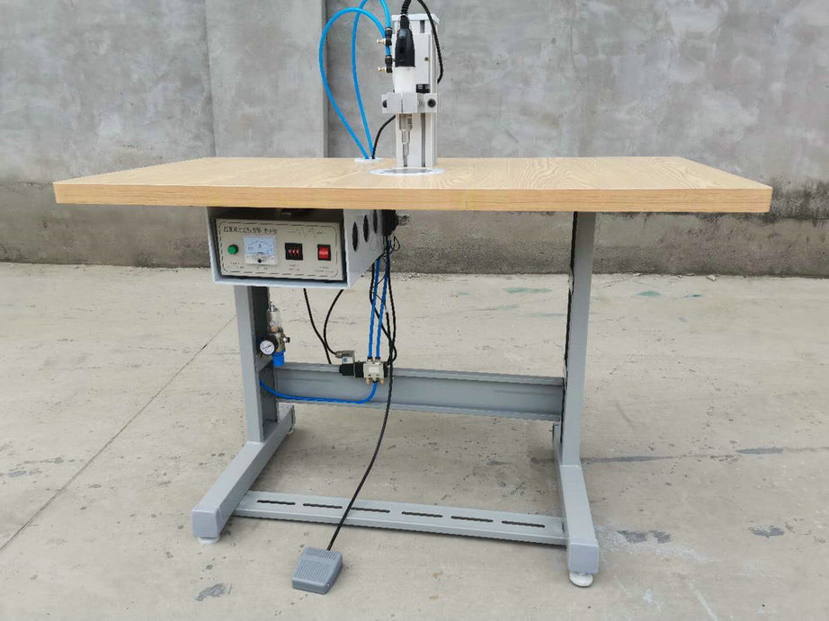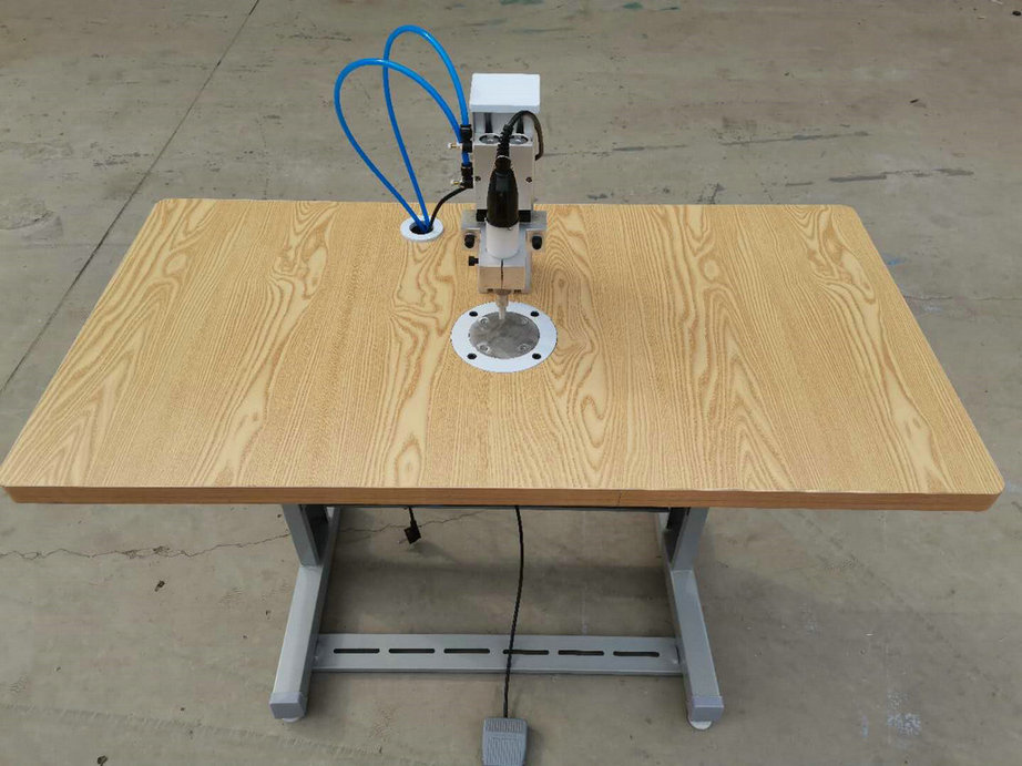 本機以超聲波將綁帶融合于口罩本體兩側(cè),進而完成綁帶式口罩成品,只需一名操作員將口罩片置于超聲波發(fā)生器的頭上,后將綁帶放在口罩片上,腳踏踏板使氣缸向下運動,縫住綁帶和口罩片。
